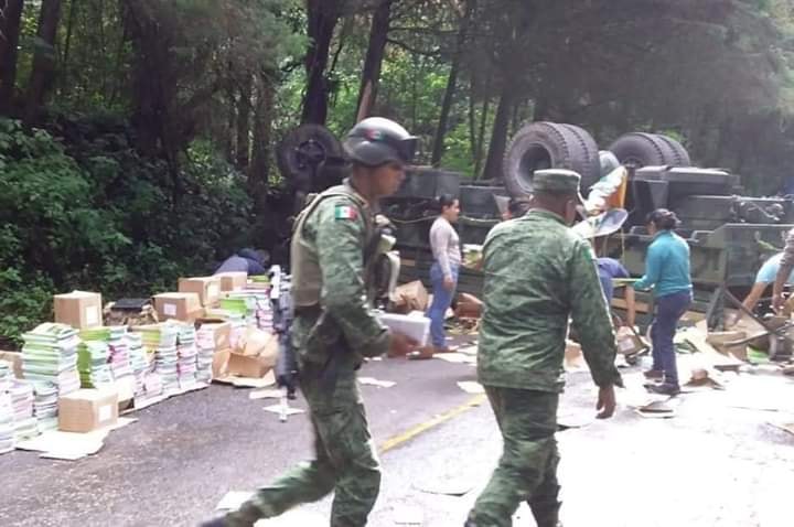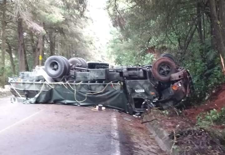 Tuxtla Gutiérrez, Chiapas.- Un vehículo militar perteneciente al 101 Batallón de Infantería terminó volcado en medio de la carretera que condice al municipio de Siltepec, a donde trasladaban un cargamento de libros de texto gratuito del Consejo Nacional de Fomento Educativo (Conafe).