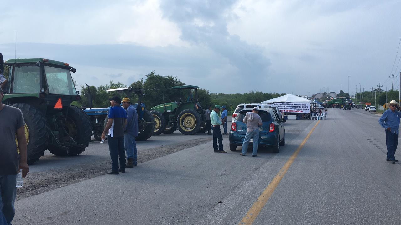 Productores agrícolas, bloquean carreteras del país, ante la reducción del presupuesto destinado al desarrollo rural, el sur de Tamaulipas no fue la excepción y desde las 8 de la mañana, un grupo de campesinos con sus tractores permanecen en la carretera «Tampico- Mante».