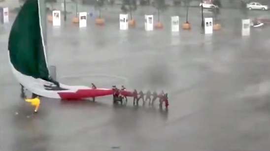 En el video difundido a través de Twitter por el periodista Manuel Durán, se observa cómo los elementos de la Policía Militar tenían dificultades para bajar la bandera durante la tormenta.