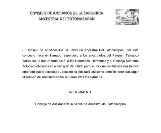 Papantla, Ver.- El Consejo de Ancianos de la Sabiduría Ancestral del Totonacapan hizo un llamado respetuoso a los encargados del Parque Temático Takilhsukut; a dar trato justo a las Hermanas, Hermanos y al Consejo Supremo Totonaco ubicados en el Kantiyan del citado parque.
