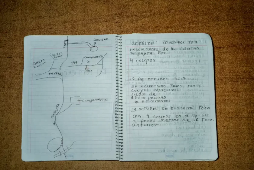 “Fue brutal porque llevaban bolsas negras y jalaban, (las) llenaban con huesos y, órale, la otra bolsa, como si fueran basura. No había ningún protocolo”, recuerda Leticia Pinzón sobre el procesamiento de las primeras fosas.