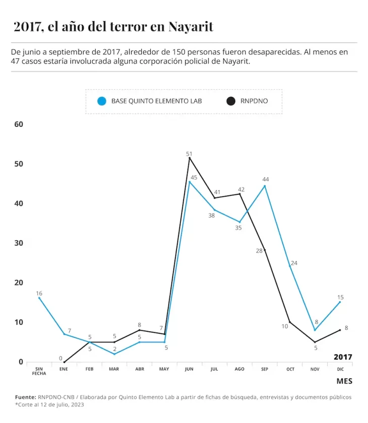 En Nayarit, las fosas brotaron y brotaron desde 2017, año en el que se encontraron seis entierros ilegales de los que se recuperaron 18 cuerpos. Al año siguiente los hallazgos fueron masivos: al menos en otras siete fosas se ocultó a 55 cuerpos. En 2019 se encontraron cuatro más con 36 personas fallecidas y en 2020 una con nueve cuerpos. Todas las víctimas habían sido desaparecidas entre junio y octubre de 2017, según identificó Quinto Elemento Lab a partir de un documento de análisis de contexto elaborado por la Comisión Nacional de Búsqueda (CNB), entrevistas a familiares y respuestas de transparencia otorgadas por la fiscalía nayarita.