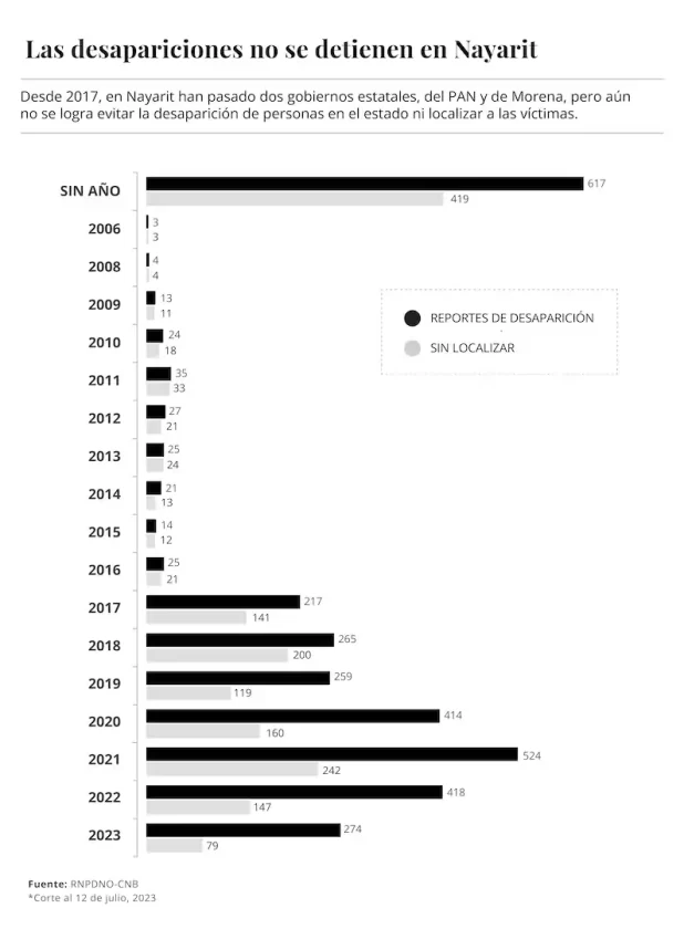 Seis años después de que Nayarit sufrió varios episodios de desapariciones masivas y forzadas, las investigaciones no avanzan a nivel estatal, pero tampoco en el ámbito federal. Las mismas familias han identificado que algunos de los presuntos perpetradores continúan trabajando para la Fiscalía General del Estado y para otras policías en la entidad.