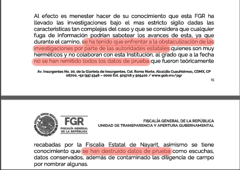 “(…) a la fecha no se han remitido todos los datos de prueba que fueron teóricamente recabadas por la Fiscalía Estatal de Nayarit, asimismo se tiene conocimiento que se han destruido datos de prueba como escuchas, datos conservados, además de contaminado las diligencias de campo por nombrar algunas”, se lee en uno de los oficios que la FGR remitió al INAI, como parte de un proceso de recurso de revisión presentado por Quinto Elemento Lab.