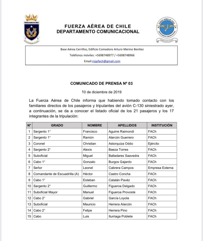 La Fuerza Aérea de Chile (Fach) reportó el lunes la pérdida de comunicaciones de un avión militar con 38 personas a bordo, este martes lo ha declaró como «siniestrado» e inició la búsqueda de sobrevivientes.