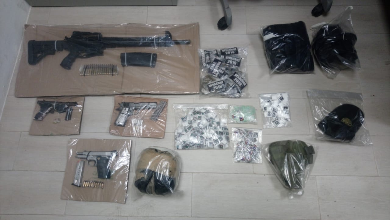 Les aseguraron cuatro armas: un fusil ATM calibre 7.62, sin matrícula; una tipo escuadra, marca Colt, calibre 38 súper, matrícula 120736; un arma calibre 22, sin marca, y una marca Smith & Wesson calibre 9, matrícula VCZ4610; cuatro cargadores, 44 cartuchos útiles, 386 dosis de cristal con la leyenda CJNG, 91 dosis de éxtasis, 60 dosis de cocaína, 27 dosis de marihuana, mil 500 kilogramos de marihuana y equipo táctico.