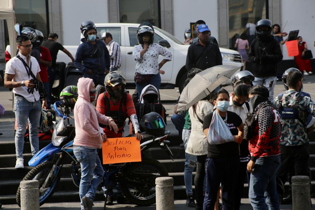 Horas más tarde, motorrepartidores de aplicaciones se manifestaron frente a Palacio de Gobierno en defensa de Antonio de Jesús, a quien identificaron como un joven que labora en su tiempo libre para pagar sus estudios.