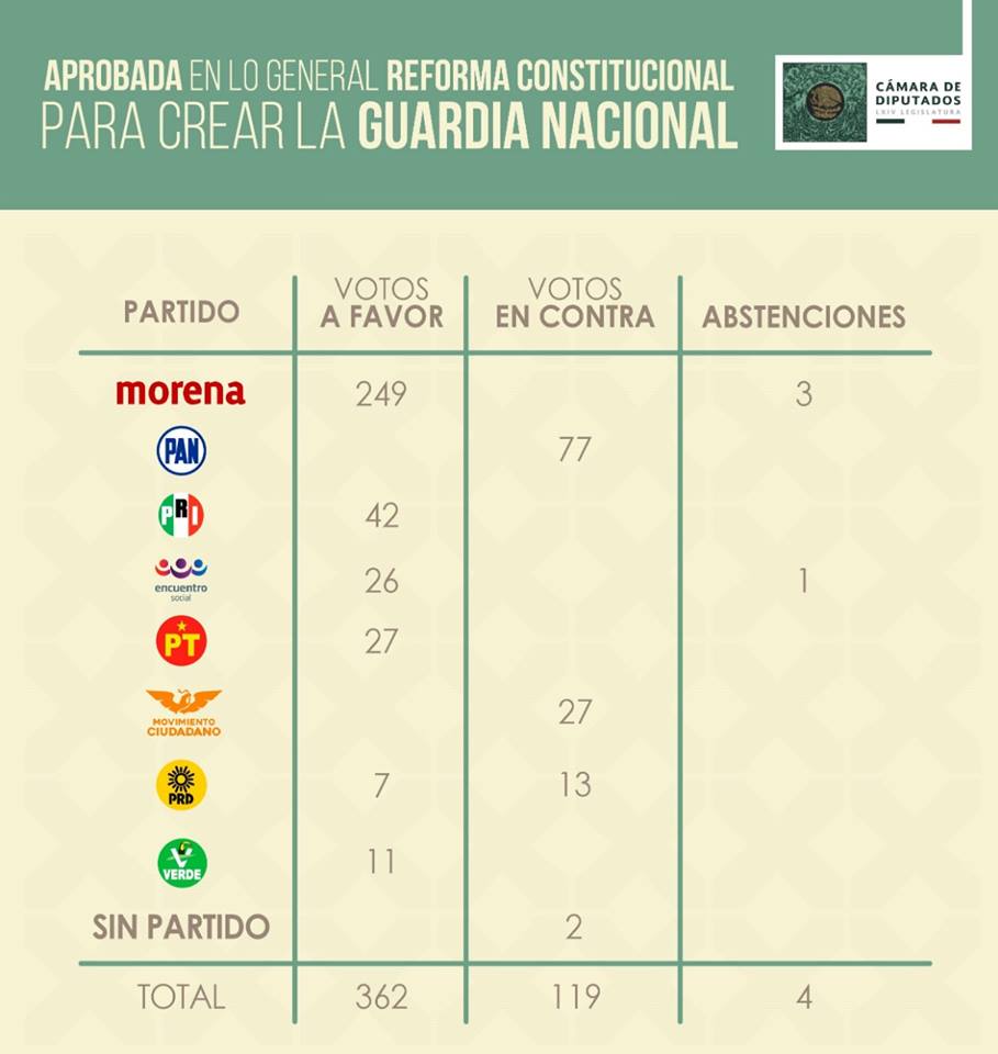 La Cámara de Diputados aprobó, en lo general, con 362 votos a favor, 119 en contra y cuatro abstenciones, el dictamen que reforma diversas disposiciones de la Constitución Política, en materia de Guardia Nacional.