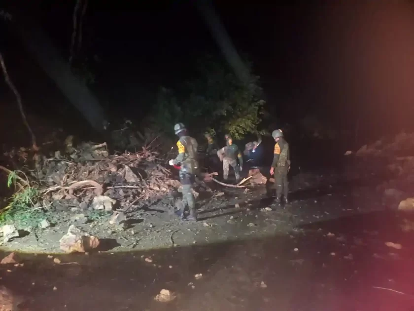 El pasado 30 de junio del 2024 y ante las condiciones meteorológicas derivadas de la Tormenta Tropical “Chris”, se desplegó el personal militar del 7/o. Batallón de Infantería para la aplicación del Plan DN-III-E en su fase de auxilo, atendiendo un deslave registrado en la carretera que comunica con Martínez Torre, a la altura del puente “El Remolino”, realizando trabajos de remoción de escombros, con el fin de reactivar la vía de acceso para la población civil este municipio.