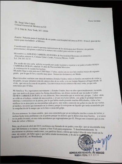 Cabe señalar que apenas el pasado lunes 27 de este agonizante primer mes del año 2020, se pudo meter un documento donde solicitan el apoyo al Consulado de Nueva York, siendo recibido con sello y firma, pero, hasta el momento no hay respuesta a su petición. Por el momento, Leydi Zuraya y familia, realizan boteos, rifas, venta de comida y varias actividades más para obtener recursos económicos, pues los medicamentos de su señor padre, son muy caros y no cuentan con el dinero suficiente para solventar sus gastos.
