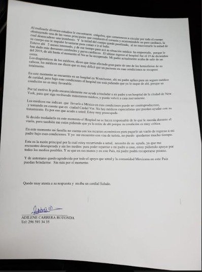 De esta manera, solicitaron apoyo a ambos consulados de México y Nueva York, a través de la Secretaría de Relaciones Exteriores, para que su padre sea repatriado cuanto antes y vía aérea pueda llegar a su país, para que sea atendido en hospitales del Estado de Veracruz. Pero, desafortunadamente, hasta el momento no han tenido respuesta favorable de los consulados y de la Secretaría de Relaciones Exteriores, ya que para ellos solo podrían darles un apoyo económico de $500 USD, pero tampoco se los han dado por la excusa de no tener dinero, anteponiendo que sería mejor que esta persona falleciera y así poder realizar los trámites de traslado en un féretro, pues como es un enfermo delicado, su traslado es muy costoso. No conforme con eso, debido a que es una persona ilegal, no pueden trasladarlo a un hospital de residentes de la unión americana, por lo que han tomado la decisión los doctores de desconectarlo y sacarlo de sus instalaciones, recayendo toda la responsabilidad en sus consanguíneos.