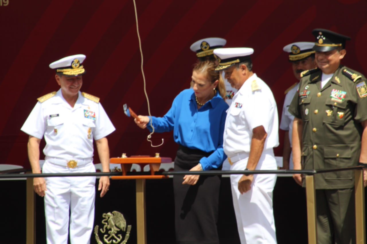 Gutiérrez Müller realizó el tradicional corte de un hilo con un hacha ceremonial para romper una botella de tequila de la región en la proa del casco como señal para el descenso del buque que se bañó por primera vez con aguas del Golfo de Mexico. Posteriormente, la batería de saludos activó 11 disparos de salva de cañón para dar la bienvenida a la nueva embarcación de la Marina Mexicana.