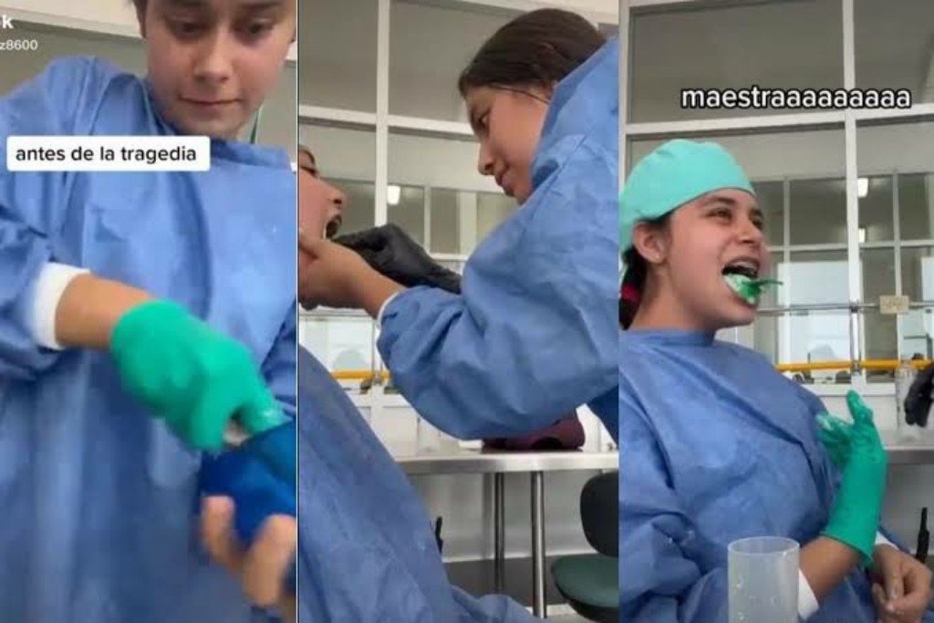 En una grabación se muestra cómo, aunque todo parecía ir con normalidad, el problema ocurrió cuando a la estudiante de odontología no se le pudo retirar el molde, pues se le quedó pegado a la dentadura.