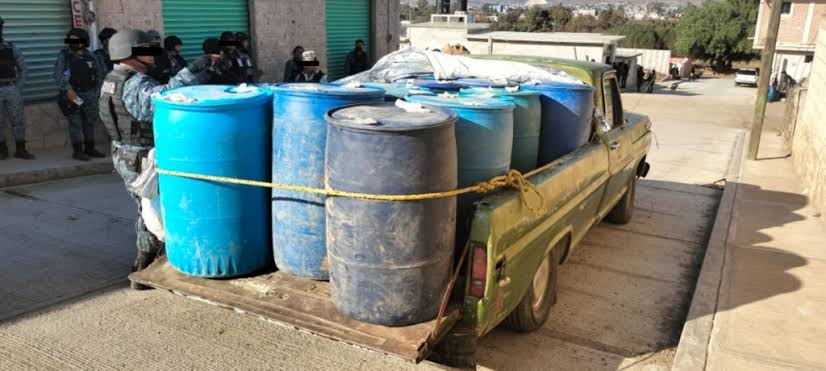 Como resultado de los trabajos de inteligencia y coordinación interinstitucional para fortalecer el Estado de derecho en el país y detectar organizaciones criminales con presencia en citada entidad, personal militar y de la Guardia Nacional, en coordinación con la FGR, localizaron 2 inmuebles en el municipio de Santiago Tulantepec, Hidalgo, en los que se tenía conocimiento que se almacenaba hidrocarburo de manera ilícita.