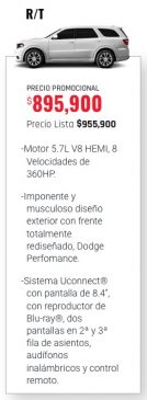 De acuerdo con el sitio web del proveedor, la camioneta Durango R/T que usará el Presidente Municipal cuenta con un motor 5.7L V8 HEMI, 8 velocidades de 360 caballos de fuerza, pantalla con reproductor Blu-ray, dos pantallas en la segunda y tercera fila de asientos, audífonos inalámbricos y control remoto.