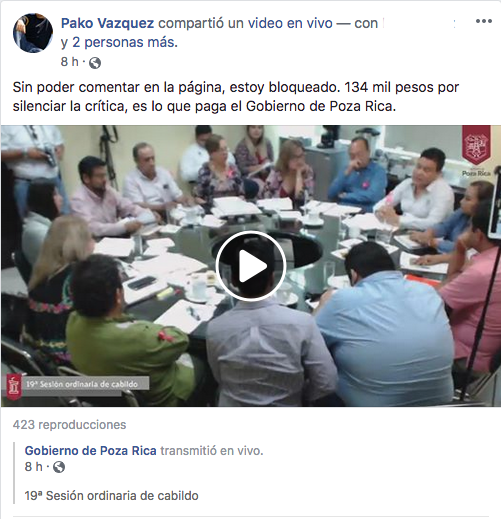 El ayuntamiento de Poza Rica podría estar vulnerado el derecho de acceso a la información y violentando el derecho de libertad de expresión, al permitir que los administradores de la página oficial en Facebook apliquen medidas restrictivas a ciertos usuarios que realizan críticas negativas en contra de la actual administración.