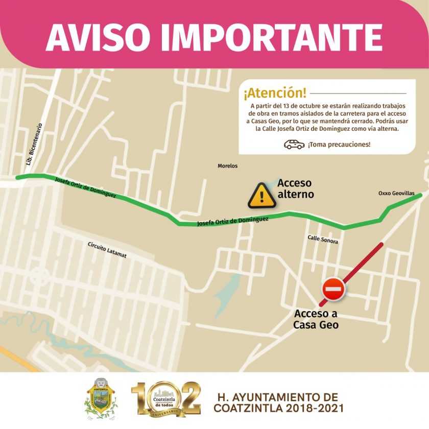 El ayuntamiento informó que con motivo de la rehabilitación del camino que conduce al fraccionamiento Geovillas y a la comunidad Tres Flechas, a partir del 13 de octubre se cerrará la circulación de la carretera, por lo que invitan a tomar vías alternas.