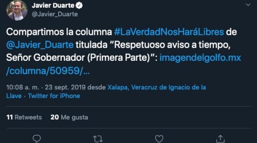 En punto de las 09:02 horas, el ex gobernador Javier Duarte de Ochoa publicó en mensaje a través de su cuenta personal en la red social Twitter, asignándole la aplicación su ubicación en la ciudad de Xalapa, pese a que se encuentra recluido en el Reclusorio Norte de la Ciudad de México, por el delito de desvío de recursos.