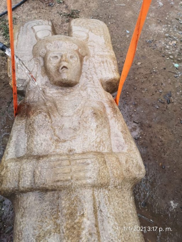 La pieza fue encontrada en medio de un naranjal, propiedad del señor Alejandro Céspedes Reyes, durante las labores de arado, quedando a resguardo del señor César Cabrera Cruz; el monolito mide aproximadamente 2 metros de alto y 48 centímetros de ancho.
