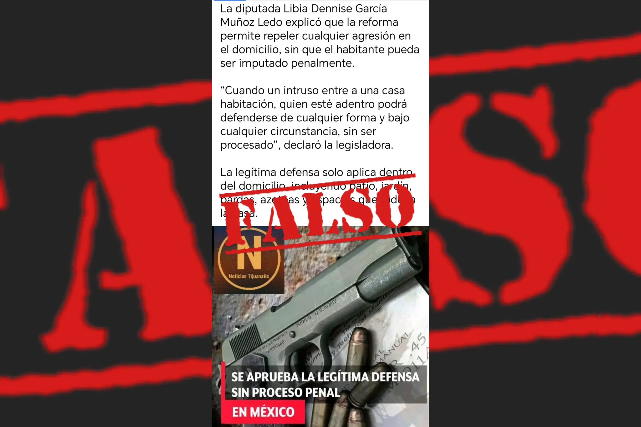 En días recientes, ha resurgido en redes sociales y cadenas de mensajería una información falsa que asegura que el Congreso de la Unión aprobó una reforma al Código Penal Federal para reconocer el “derecho absoluto” a la legítima defensa dentro del hogar, sin consecuencias penales para quien repela una agresión, incluso si ello deriva en lesiones graves o la muerte del agresor.