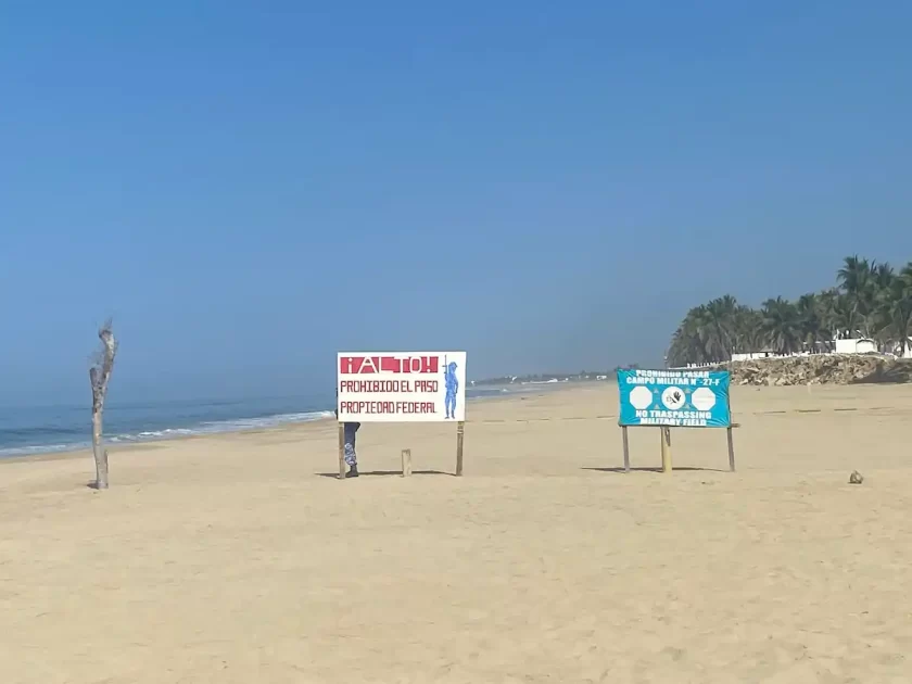 En el recorrido por la playa, un militar de uniforme color crema, tipo camuflaje del desierto, aparece de la nada y corta el paso. Estaba escondido detrás de un letrero azul en el que se adivina la palabra “STOP”; es un retén perdido entre carpas con camastros en los que se ofrecen masajes con aceite de coco, junto a hileras de palapas donde los viajeros se dan tremendas comilonas hasta que atardece.