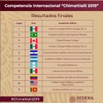 Ciudad de México.- Las representaciones del Heroico Colegio Militar y de la Heroica Escuela Naval Militar obtuvieron el primer, cuarto y noveno lugares durante la competencia internacional Chimaltlalli 2019 que reunió a los selectivos de academias militares de nueve naciones.