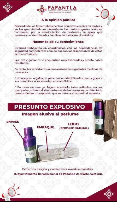 El ayuntamiento de Papantla emitió un comunicado en el que advierte a la ciudadanía sobre la nueva modalidad de agresión, en la que los atacantes entregan supuestos regalos, como perfumes en spray, que en realidad contienen explosivos que se activan al oprimir el aspersor.