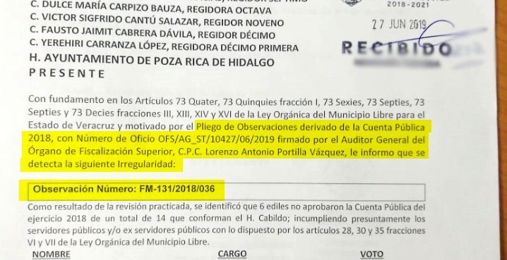 Poza Rica, Ver.- En un movimiento poco claro, la Contraloría Municipal a cargo de José Manuel Lugo Dauzón, solicita a los regidores que votaron en contra la aprobación de la Cuenta Pública 2018, aclaren los motivos para su decisión, citando un supuesto oficio girado por el Órgano de Fiscalización Superior (ORFIS) en el que la dependencia presuntamente acusa a los seis regidores que no la aprobaron, de haber incumplido con lo dispuesto en tres artículos de la Ley Orgánica del Municipio Libre.