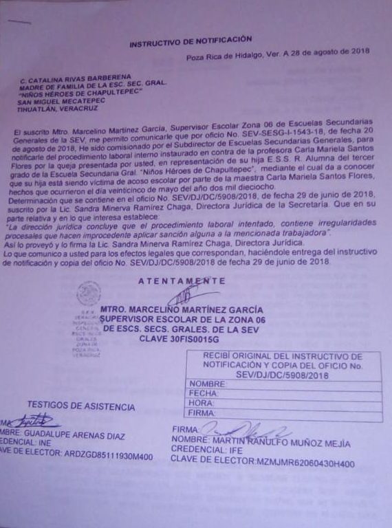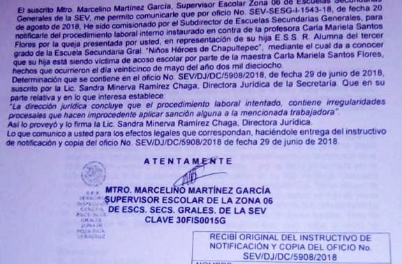 Ella asegura que el inspector Escolar, Marcelino Martínez García recibió las pruebas y documentó los hechos como parte de la investigación, sin embargo realizó la indagatoria insuficiente, por lo que el departamento jurídico de la Secretaría de Educación de Veracruz emitió un documento en el que no procedía por deficiencias en las pruebas.
