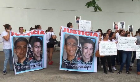 Previo al inicio de la audiencia de implicados en la desaparición y homicidio del estudiante de la facultad de comercio de la U.A.T., Mario Eduardo Olivo Acuña, un grupo de familiares y amistades vestidos con playeras blancas, protestó en el exterior del palacio de justicia en Altamira.