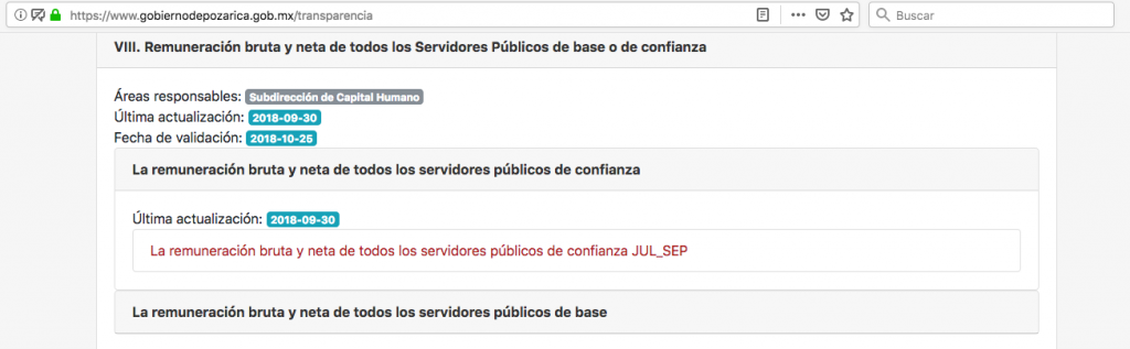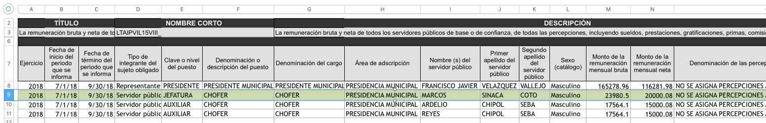 Conforme al documento público disponible en el enlace http://cort.as/-CHwd del portal de Transparencia, Marcos Sinaca Coto aparece como chofer con el cargo de jefatura, adscrito a la Presidencia Municipal, con un salario neto de 20 mil pesos mensuales en el periodo comprendido entre el 1 de julio y el 30 de septiembre de 2018.