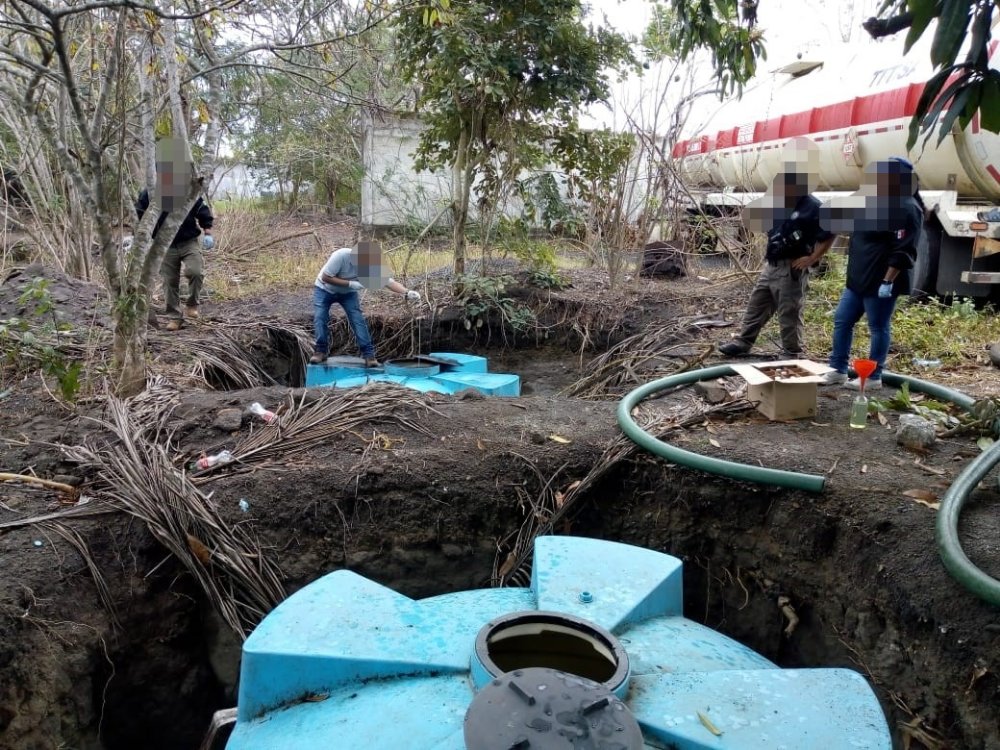 En el lugar inspeccionado, los elementos federales localizaron 11 mil 350 litros de hidrocarburo, distribuido en 96 tambos metálicos, dos tinacos de material sintético los cuales se encontraban enterrados, 71 contenedores de plástico con arnés metálico, así como varias mangueras de plástico.