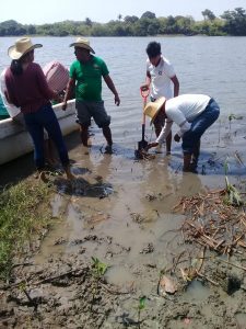 Cazones, Ver.- Alumnos del Telebachillerato de la comunidad Coyol Norte e integrantes de la asociación Tortugas Marinas del Totonacapan realizaron tareas de reforestación de la margen del río, plantando árboles de mangle para la restauración del ecosistema.