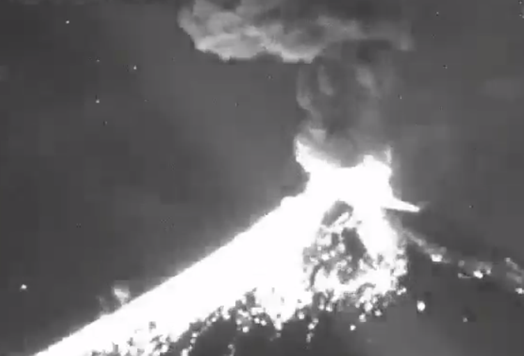 El sistema de monitorieo del Centro Nacional de Prevención de Desastres (Cenapred) registró en video el momento en que ocurrieron dos explosiones en el volcán Popocatépetl, la primera a las 22:44 horas y la segunda, de mayor intensidad, a las 23:22 horas.
