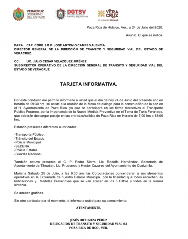 A través de la tarjeta informativa con fecha del 24 de julio, firmada por el delegado Jesús Ortigoza Pérez, se detalla que por decisión tomada durante la “Mesa de diálogo para la construcción de la paz”, realizada en el Ayuntamiento de Poza Rica, a partir de este sábado 25 de julio se restringirá el acceso a los taxis foráneos en horario de 7:00 a 18:00 horas.