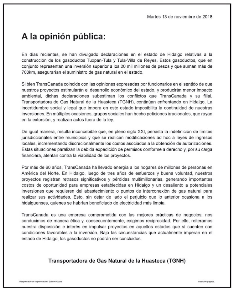A través de un correo electrónico, la empresa Transportadora de Gas Natural de la Huasteca (TGNH), filial de TransCanada, que realiza los trabajos de construcción del gasoducto Tuxpan-Tula-Villa Reyes, confirmó que las obras se encuentran detenidas en el estado de Hidalgo, mientras que en Puebla se encuentran a la espera de que concluyan las consultas indígenas respectivas.