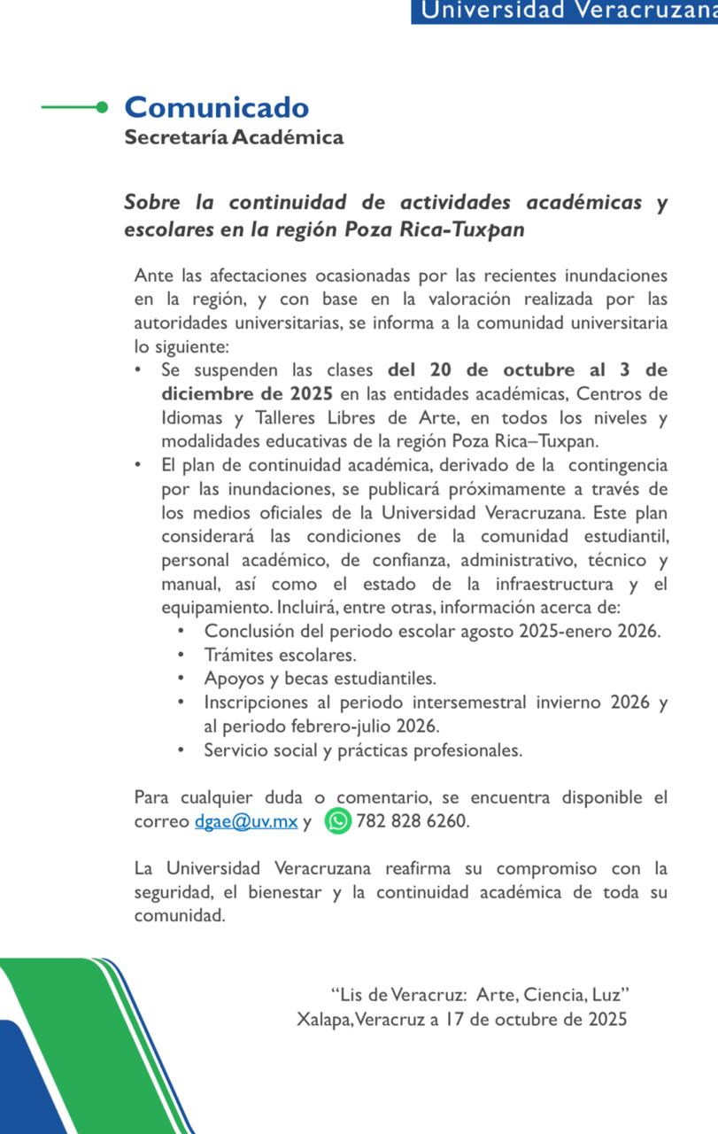 Xalapa, Ver.- La Universidad Veracruzana (UV) anunció la suspensión de clases en la región Poza Rica-Tuxpan del 20 de octubre al 3 de diciembre de 2025, debido a las afectaciones ocasionadas por las recientes inundaciones en el norte del estado.