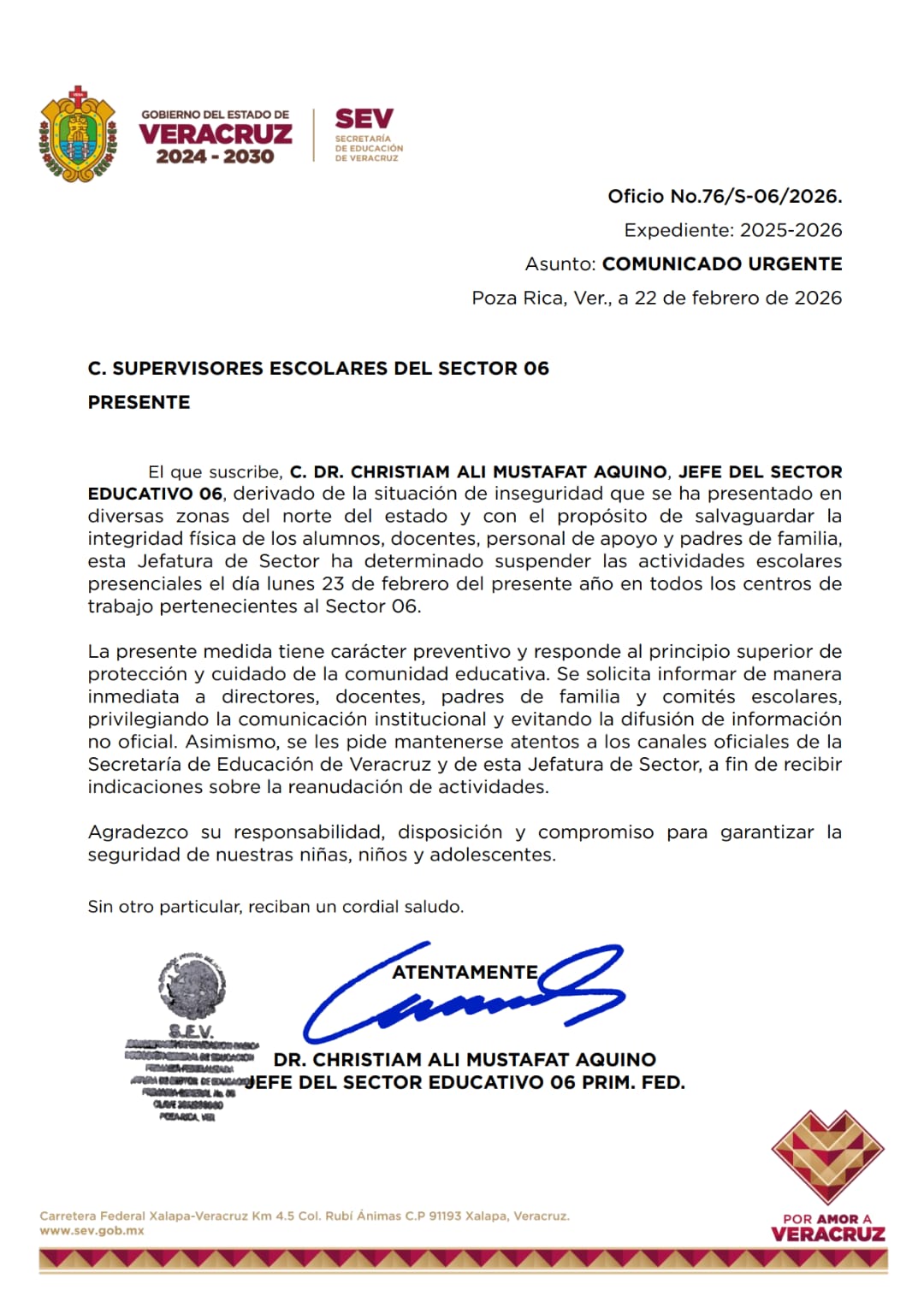 El comunicado fue emitido desde Xalapa, el día de hoy 22 de febrero de 2026, reiterando el compromiso institucional con la seguridad y el bienestar de la comunidad universitaria.