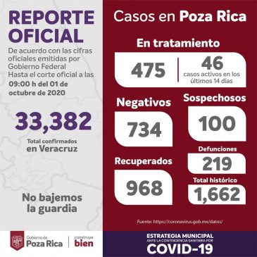 Sin embargo, en el portal coronavirus.gob.mx/datos/ al seleccionar exclusivamente al municipio de Poza Rica, a las 20:26 horas de este mismo 03 de octubre, la Secretaría de Salud no había actualizado las cifras, por lo que se mantenían las del 02 de octubre.