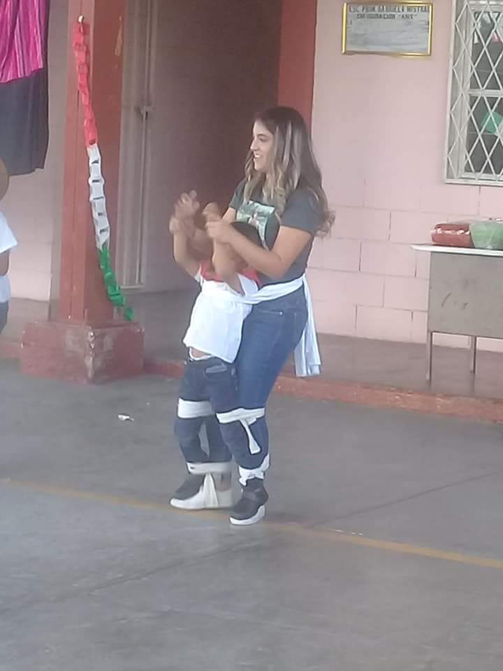 Se observa a la profesora identificada como Melissa durante la realización de un baile regional mexicano en un festival escolar, en el cual ata a su cuerpo al menor para que pueda participar del bailable con sus compañeros de clase.
